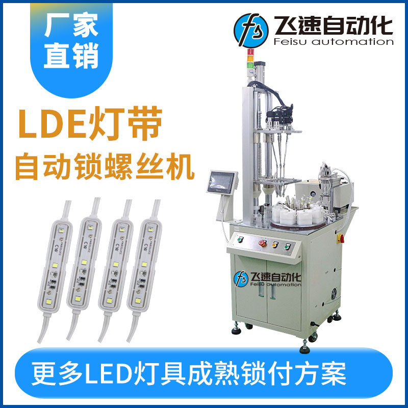 led燈帶是指把LED組裝在帶狀的柔性線路板或PCB硬板上,產(chǎn)品形狀象一條帶子又非常節(jié)能和綠色環(huán)保,用于各個(gè)行業(yè)中的裝飾,LED燈帶的使用也越來(lái)越普及,也因?yàn)槭褂脡勖L(zhǎng)(一般正常壽命在8~10萬(wàn)小時(shí)),所以在市場(chǎng)上需求也比較大。 LED燈帶是采用FPC做組裝線路板,生產(chǎn)組裝過程中都需要對(duì)燈具貼片和各個(gè)工件進(jìn)行螺絲緊鎖加工,在傳統(tǒng)的生產(chǎn)線上,技術(shù)工人需要對(duì)不同型號(hào)的燈具體分別進(jìn)行螺絲鎖緊加工操作,雖然也應(yīng)用了自動(dòng)機(jī)器人之類的自動(dòng)設(shè)備,但是傳統(tǒng)生產(chǎn)線的自動(dòng)化水平還比較低,不能適用于不同型號(hào)的燈具加工,設(shè)備的自動(dòng)化水平還需提高。 本案例應(yīng)用于LED燈帶自動(dòng)化生產(chǎn)線的自動(dòng)鎖螺絲機(jī),主要目的在于解決生產(chǎn)中的不足和缺點(diǎn),設(shè)計(jì)一臺(tái)自動(dòng)化燈具生產(chǎn)螺絲設(shè)備,它不僅可以對(duì)燈具進(jìn)行自動(dòng)化地組裝、鎖緊加工操作,而且可以適用于不同型號(hào)、規(guī)格、大小的燈具體,設(shè)備的自動(dòng)化水平比較高。 該設(shè)備根據(jù)產(chǎn)品進(jìn)行設(shè)計(jì)多工位轉(zhuǎn)盤式螺絲機(jī),通過在轉(zhuǎn)盤式安放多個(gè)工位實(shí)現(xiàn)多工序同步作業(yè),主要是為了實(shí)現(xiàn)擰螺絲和取放產(chǎn)品同步完成,作業(yè)員不停放置產(chǎn)品,設(shè)備不停擰螺絲,增強(qiáng)了人機(jī)協(xié)作,較大幅度提升效率,減輕人工勞動(dòng)強(qiáng)度。
