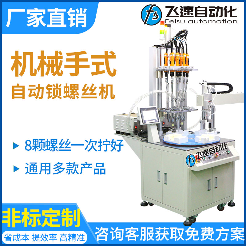 • 產(chǎn)品簡介: 本案例為轉(zhuǎn)盤機械手式自動擰螺絲設備,可以一次擰好產(chǎn)品上的8顆螺絲,并結合流水線生產(chǎn)。 飛速自動化廠家提供一臺轉(zhuǎn)盤機械手式自動擰螺絲機,通過配置轉(zhuǎn)臺和機械手臂,由設備一次擰好8顆螺絲,擰好螺絲的產(chǎn)品由機械手臂抓起并放入流水線,設備可實現(xiàn)多軸擰螺絲、取放產(chǎn)品 、送螺絲、員工放置工件等多工位同步圓周作業(yè),生產(chǎn)效率極高。