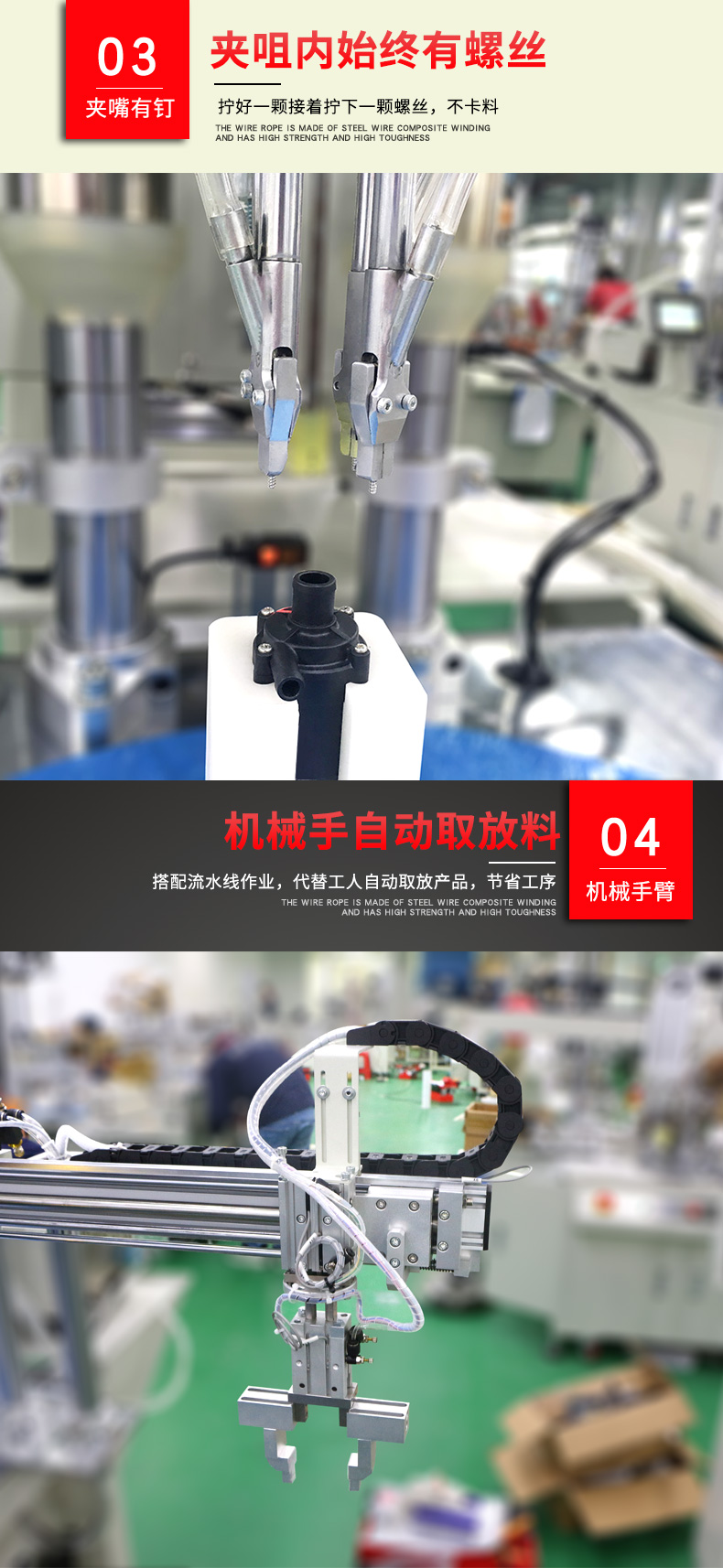 該臺攝像頭自動擰螺絲機,是用來擰攝像頭上面和側(cè)面的螺絲。另外根據(jù)客戶要求,我們這邊同時搭配了機械臂,通過機械臂將產(chǎn)品轉(zhuǎn)移至流水線上,方便客戶節(jié)省時間,提高客戶生產(chǎn)產(chǎn)能。